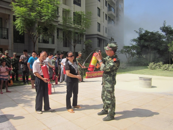 演练开始后,南宁市消防支队王中队作为本次演练活动指导官,整个活动共进行消防逃生技巧讲解及演练,楼栋人员疏散逃生演练,灭火器操作等各项演练项目。首先,王中队在现场给大家讲解了消防逃生技巧,荣和物业部分员工及小区部分业主分别进行了缓降器救人、救生气垫逃生技巧,节绳自救逃生演练项目;紧接着进行了人员疏散逃生演练,在浓烟滚滚的楼栋里,参加演练的业主们口捂毛巾,弯腰小跑从楼栋里有序地疏散,完全严格按照本次的消防演练要求完成了本环节演练;最后,活动进行了灭火器操作,到场观看演练的业主们纷纷加入灭火器操作演练中。小小灭火器虽看操作简单,但需要注意的事项还有很多,针对业主们操作中出现的问题,王中队也对这些问题进行一一更正,对提高业主们正确使用灭火器起到了很大的帮助作用。活动最后,消防部门还给现场业主们送上了防烟面具,灭火器等消防器材。
