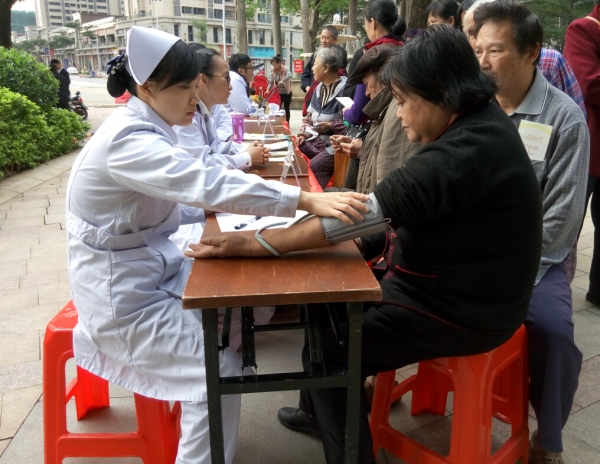 当天早上9时30分,来自五村岭社区医院的11名医护人员已经摆放好桌椅、拉好横幅,桌上放着内科、外科、妇科、骨科、耳鼻咽喉科的牌子和健康宣传资料,等待居民上前咨询。活动现场,医护人员针对一些中老年人常见病进行了现场诊治答疑,为居民们量血压、测血氧,为老年人采耳、检测听力,为耳障老年人讲解助听器的正确佩戴等,尤其对老年人的身体状况给予特殊关注,为他们做细致的检查,分析病情,讲解注意事项,并介绍一些常见病、多发病的预防诊治等。医护人员还为大家免费测量血糖,量血压,对于血压偏高的居民,医生现场给予饮食、用药建议,讲解高血压、糖尿病的危害及防治,提高群众对高血压疾病的认识,为大家讲解日常保健和疾病预防知识并发放健康科普宣传资料。