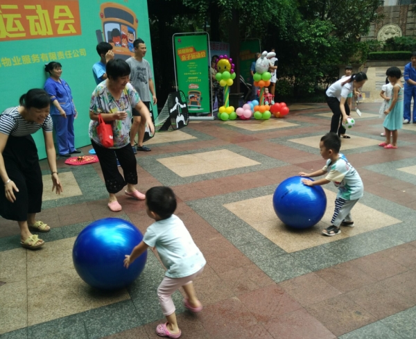 当天早上8:30,虽然天公不作美,细雨飘飘,中央公园服务中心各部门齐心协力准时布置场地,业主也陆续来到现场等待着活动的开始。9:00,我们的场地布置完毕,各项游戏玩具摆放到位,播放音乐,吸引更多业主前来围观增长人气。本次活动,我们设置了三个游戏:1、巨球传运;2、袋鼠跳;3、跳绳。