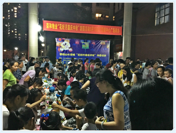中秋佳节来临之际,荣和山水绿城于9月13日晚上在营销中心广场举办“花好月圆庆中秋”游园会。下午5点,工作人员就开始忙乎了起来,洗水果,搬礼品,摆桌椅,灯光布置,一切准备工作正如火如荼的进行着。此次游园活动为业主精心准备了陶艺彩绘、投飞镖、心有灵犀以及听歌抢猜歌名游戏环节,还有更精彩的!当我们把彩绘的公仔拿出来,现场瞬间变成了孩子们的天地,大家有序的排队登记领取公仔,然后坐在位置上认真的画起来。