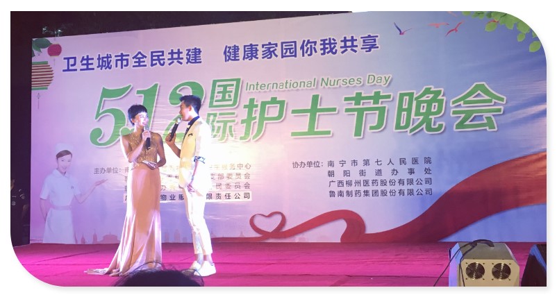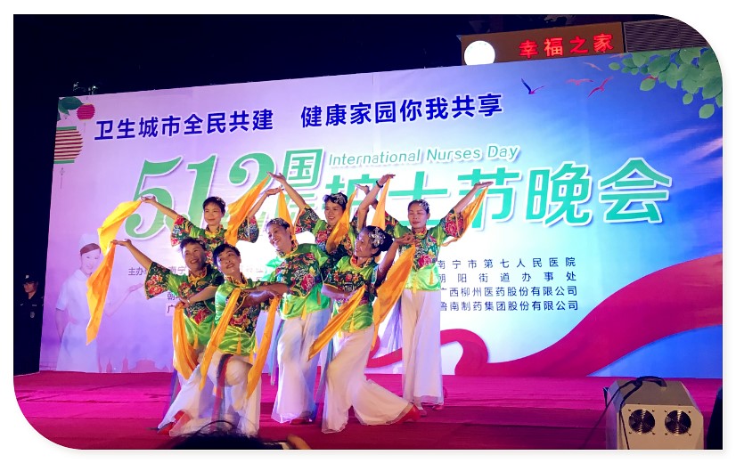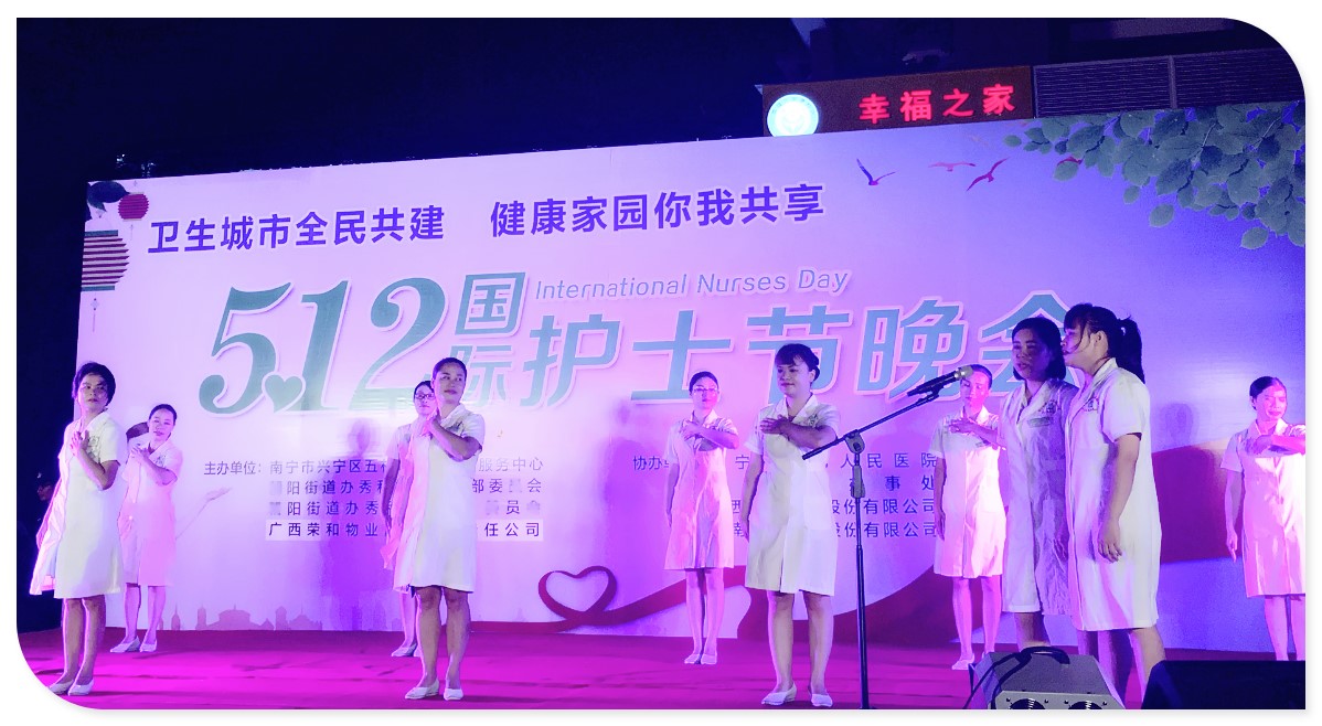 为增进社区居民对护理职业的认可,提高健康意识,荣和山水绿城物业服务中心与南宁市兴宁区五村岭社区卫生服务中心(社区医院)、南宁市朝阳办秀和社区居委会等单位携手举办5.12护士节文艺晚会,以晚会形式营造一个欢乐、祥和、健康的社区氛围。